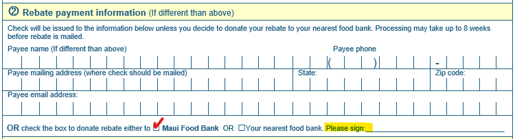 To donate, simply check the appropriate box in “Section 2 – Rebate Payment Information” on your rebate application then sign next to it. See example below: