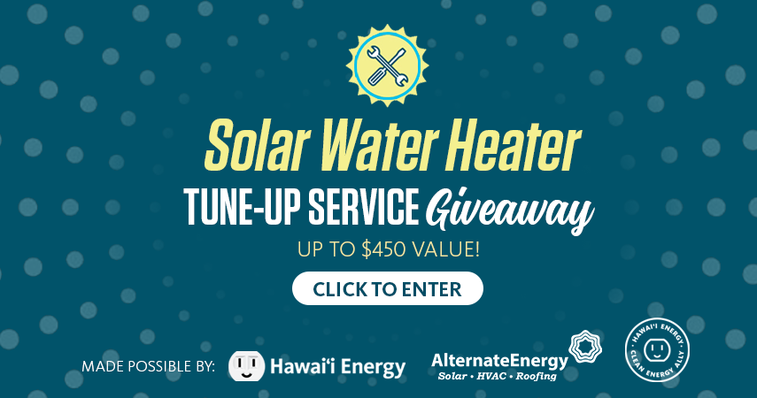 Got a solar water heater in need of a tune-up service? Click here or on the image below to enter for your chance to win it! Up to $450 value prize provided by Hawaii Energy and Clean Energy Ally Alternate Energy. Some restrictions apply, see official rules for details.